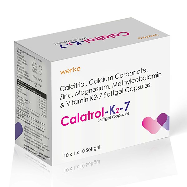 Calcium Carbonate 500 mg, Calcitriol 0.25 mcg, vitamin K27 45 mcg, Zinc 7.5 mg, Magnesium 20 mg and Methylcobalamin 1500 mcg. We offer 10×1×10 with Alu Packaging.