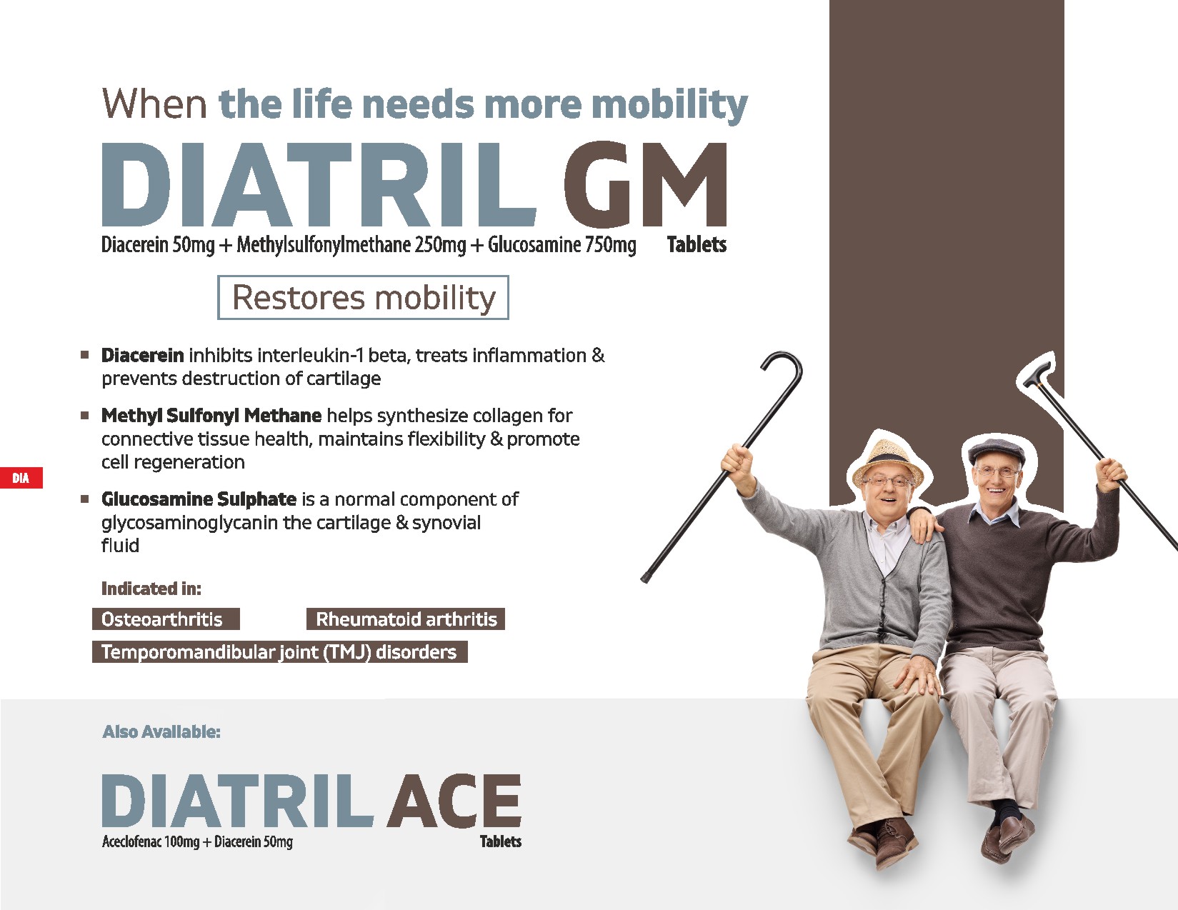 Diacerein 50 mg + Methylsulphonylmethane 250 mg + Glucosamine 750 mg.