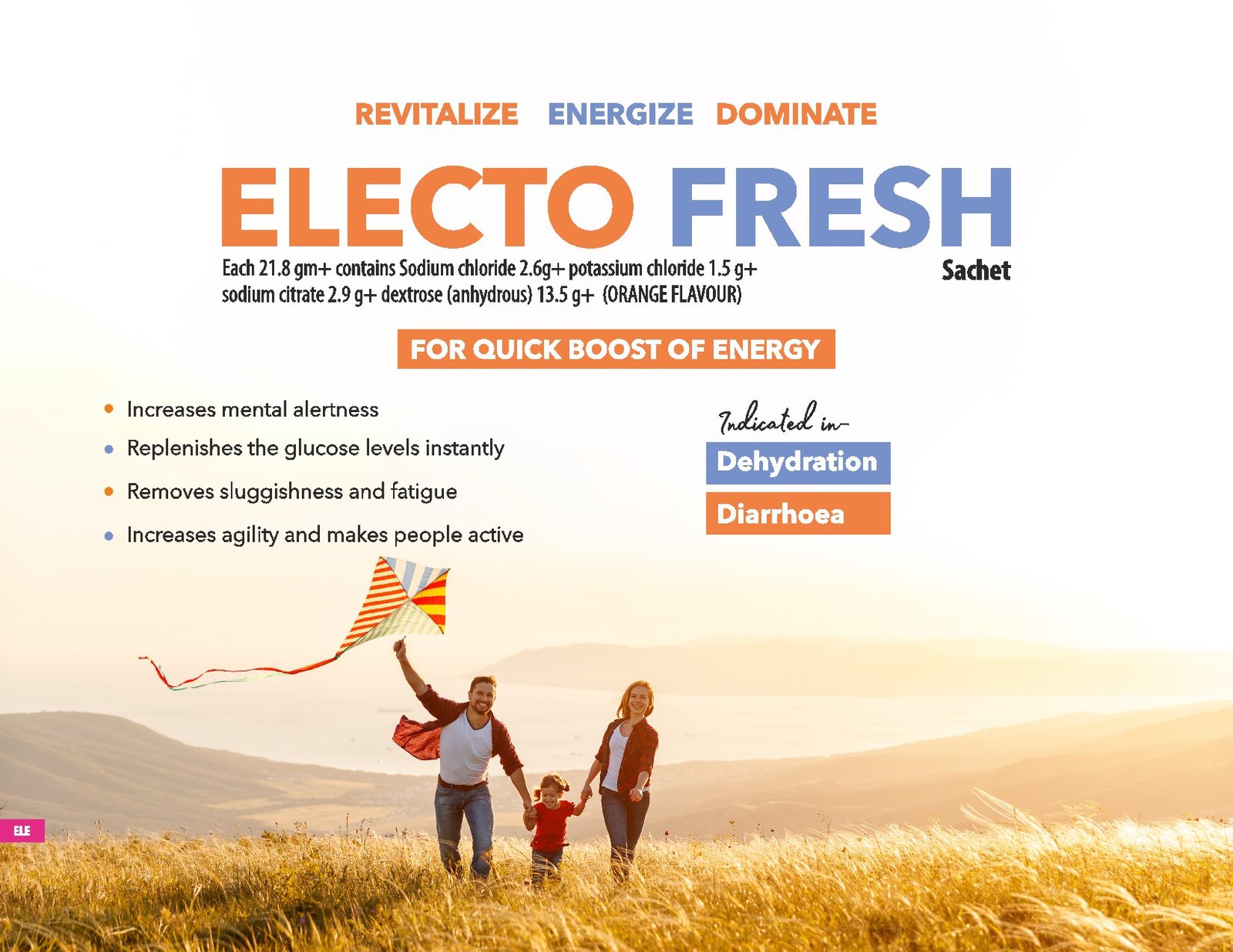 Sodium chloride 2.6g, potassium chloride 1.5 g sodium citrate 2.9g dextrose (anhydrous) 13.5 g (ORANGE FLAVOUR)