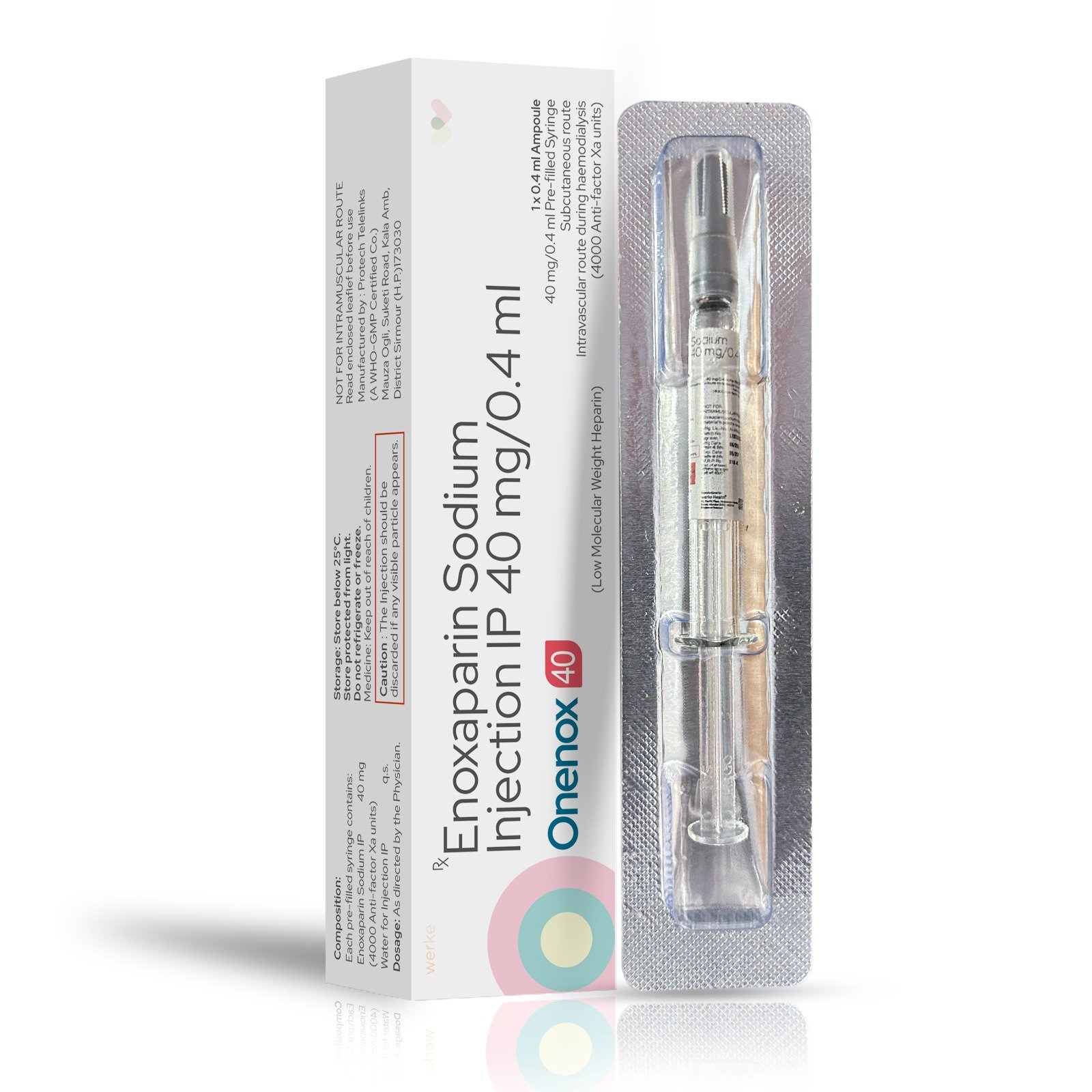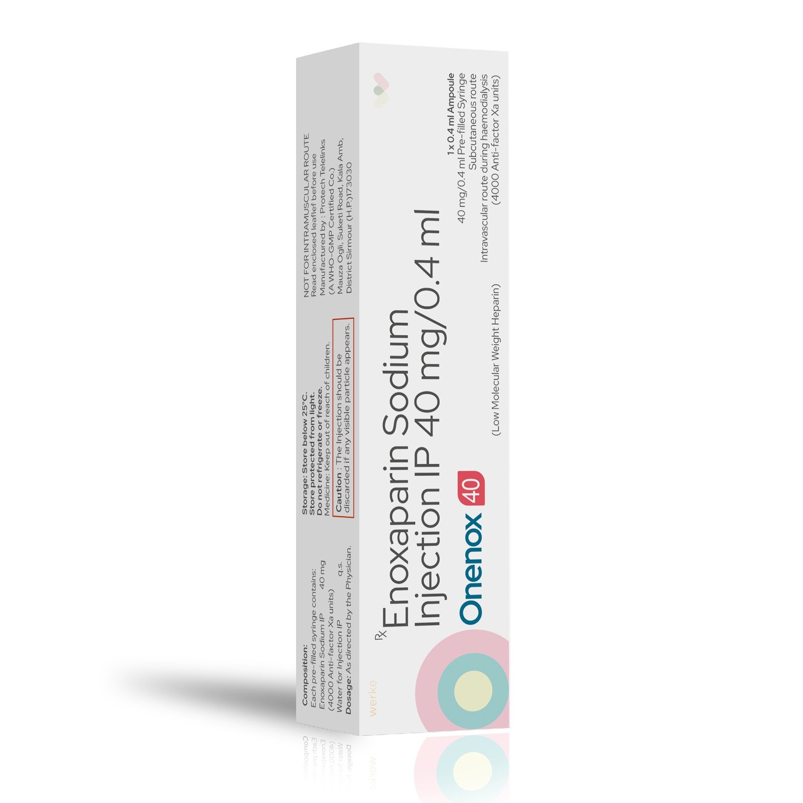 ONENOX 40 Injection – Enoxaparin Sodium Injection IP 40 MG is a low-molecular-weight heparin (LMWH) used as a blood thinner to prevent and treat blood clots. Doctors commonly use it for: Prevention of deep vein thrombosis (DVT), especially after surgery; Prevention of pulmonary embolism (PE); Treatment of existing blood clots; Protection of patients during prolonged bed rest or hospitalization; and Management of certain heart conditions, such as unstable angina or non-ST elevation heart attack. It works by preventing clot formation and improving blood flow. It should always be given under medical supervision, usually injected in the abdomen.