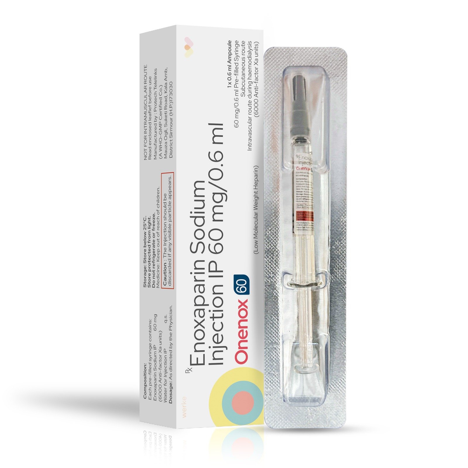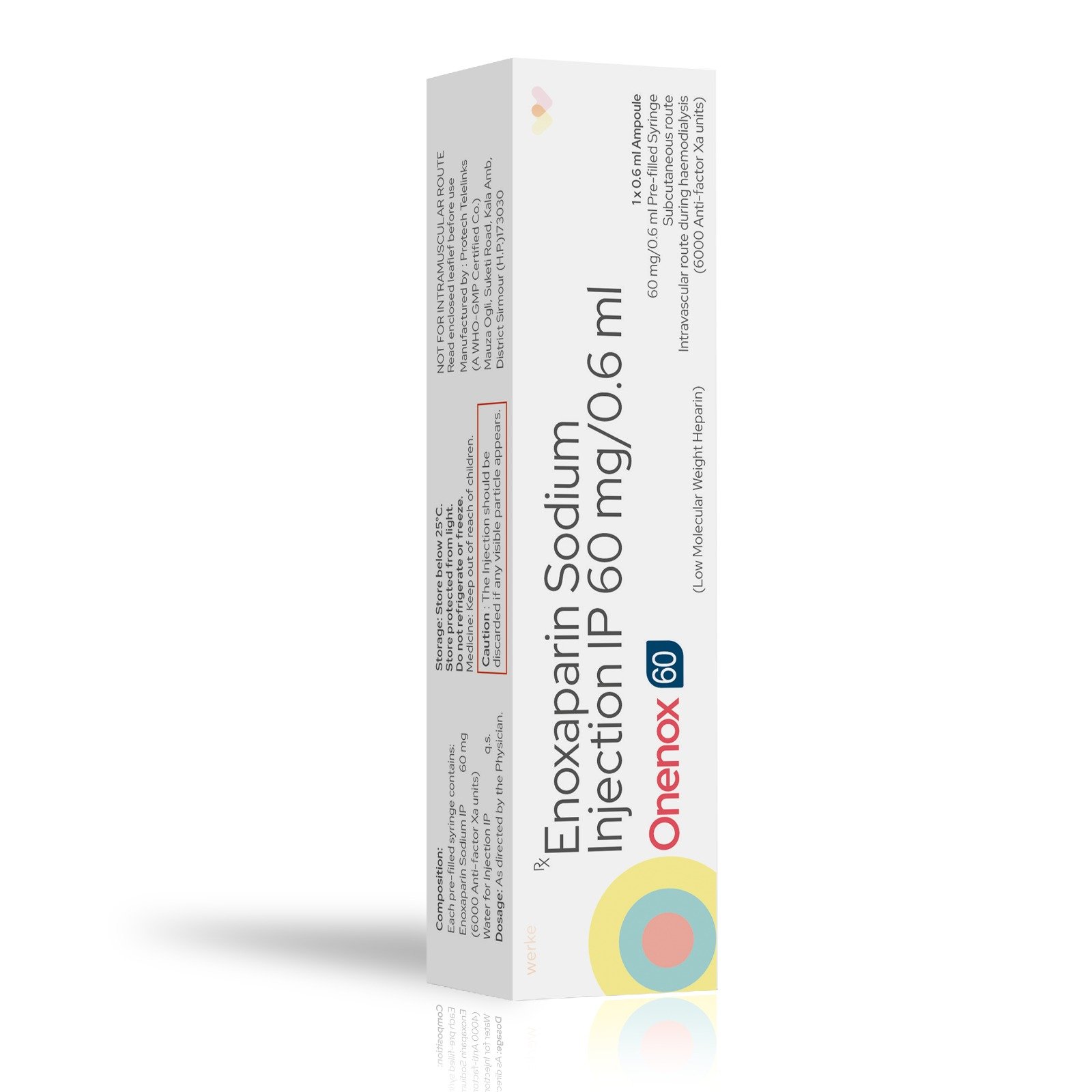 ONENOX 60 Injection – Enoxaparin Sodium Injection IP 60 MG is a low-molecular-weight heparin (LMWH) used as an anticoagulant (blood thinner). Doctors prescribe it for: Prevention and treatment of deep vein thrombosis (DVT), Prevention of pulmonary embolism (PE), Management of unstable angina and certain types of heart attack (NSTEMI), Prevention of clot formation during hospitalization or prolonged immobility, and Post-surgical clot prevention, especially after orthopedic or abdominal surgery. It works by stopping harmful blood clots from forming and improving circulation. It should be administered under medical guidance, usually by subcutaneous injection into the abdomen.