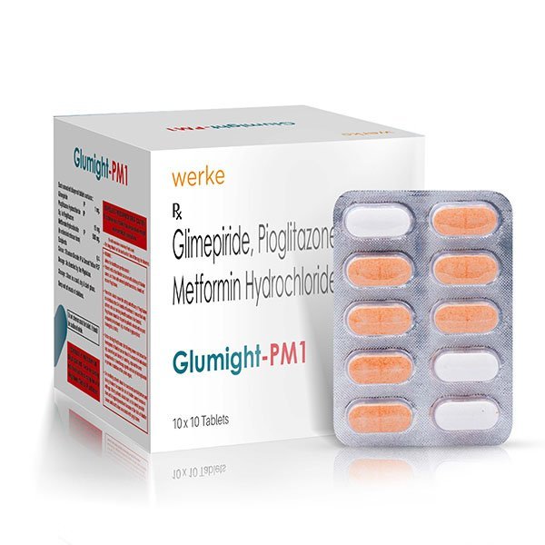 Werke Health new launch – Glumight PM1 which contains Glimepiride 1 mg + Pioglitazone 15 mg + Metformin 500 mg. Being an ethical type, this medicine of Werke Health is of premium quality and is manufactured in top pharmaceutical companies. Werke Health delivers its Glimepiride 1 mg + Pioglitazone 15 mg + Metformin 500 mg tablets in secure & safe packs.