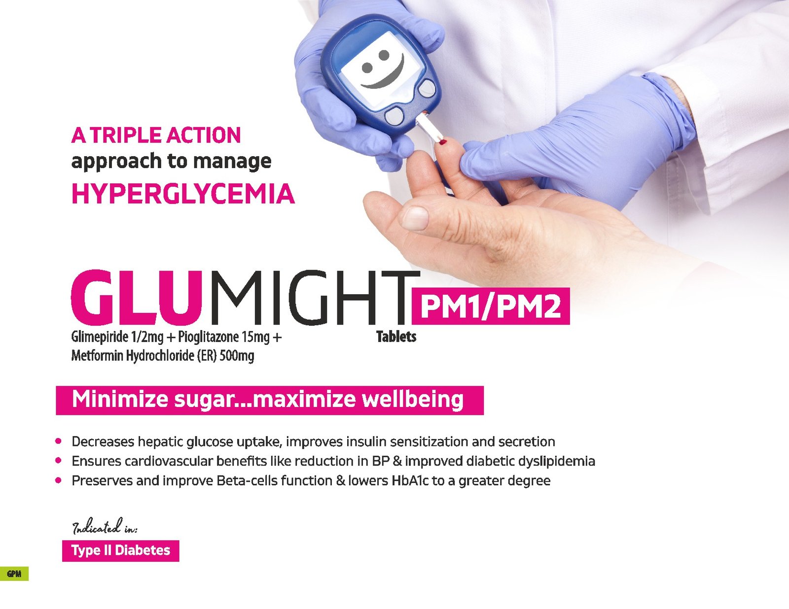 Glumight PM2 is a combination medicine that helps people with type 2 diabetes. It has three active ingredients: Glimepiride: It makes the pancreas make more insulin, which lowers blood sugar. Metformin: It makes cells in the body more sensitive to insulin and stops the liver from making glucose. Pioglitazone makes insulin work better in cells, which helps them take in more glucose. When used together, they work to control blood sugar and lower the risk of diabetes complications.