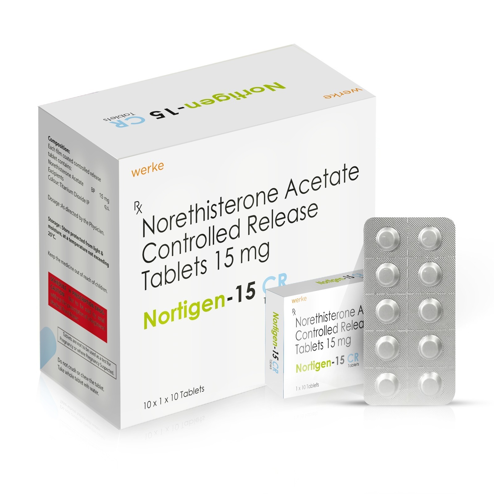 Nortigen15 CR Tablets – Norethisterone Acetate Controlled Release Tablets 15 mg is used to manage menstrual and hormonal disorders in women. It helps control heavy or irregular periods, delayed menstruation, and conditions like endometriosis. The controlled-release formula ensures steady hormone levels, providing prolonged relief and better cycle regulation when taken as prescribed by a gynecologist.