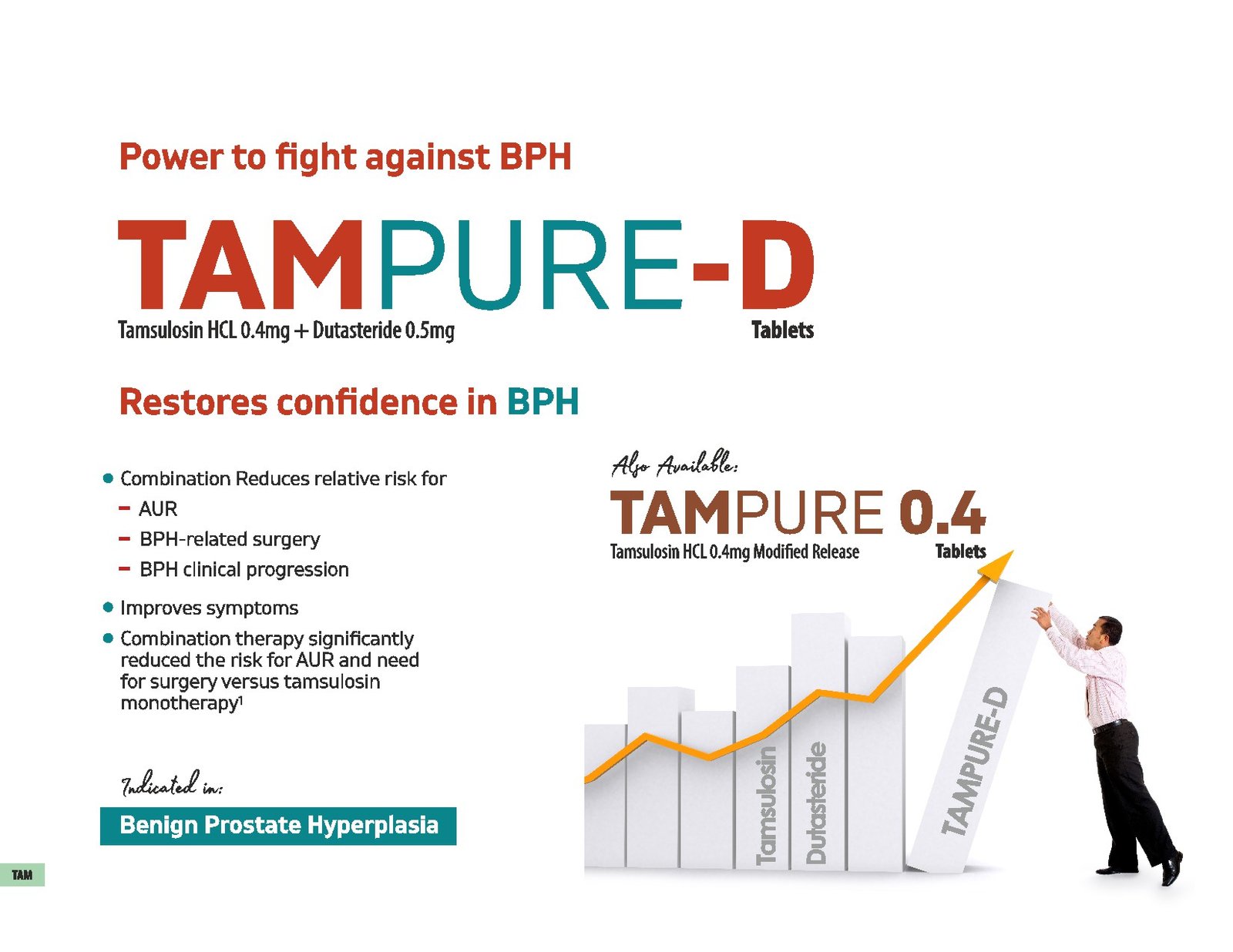 TAMPURE 0.4 Tablets (Tamsulosin HCI 0.4 mg Modified Release) help in easing urine flow in men who face trouble due to an enlarged prostate. It relaxes the muscles around the bladder and prostate, making urination smoother and less urgent. Tamsulosin HCI 0.4 mg tablet is commonly used in BPH (Benign Prostatic Hyperplasia) and gives relief without shrinking the prostate gland.