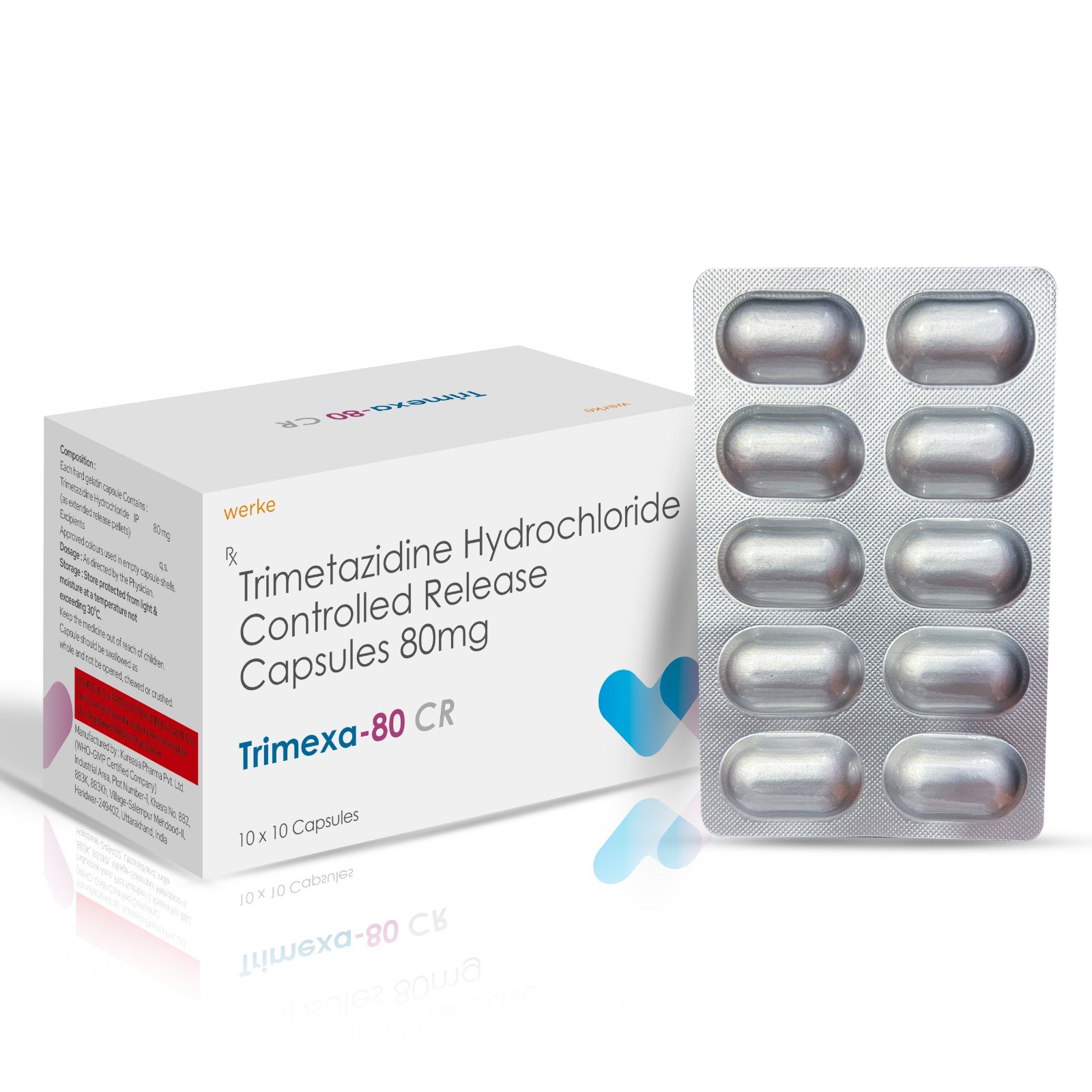 Trimexa 80 CR Capsules – Trimetazidine Hydrochloride Controlled Release Capsules 80 Mg  is prescribed to help manage chronic stable angina (chest pain caused by reduced blood flow to the heart). It works by protecting heart cells during low oxygen supply and improving their efficiency, which helps reduce chest discomfort and allows patients to stay active with fewer symptoms. Cardiologists mainly prescribe this medicine as add-on therapy along with other heart treatments. It should be taken regularly as directed for best results.