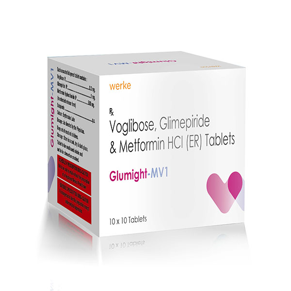 Glumight MV1 Tablets — Voglibose, Glimepiride & Metformin HCI (Extended Release) is used for the management of type 2 diabetes mellitus. Voglibose helps control post-meal sugar spikes by slowing carbohydrate absorption, glimepiride increases insulin release, and metformin extended-release reduces glucose production and improves insulin sensitivity. Together, they provide steady blood sugar control, support better glycemic balance, and help reduce the risk of diabetes-related complications when taken regularly with a proper diet and lifestyle.